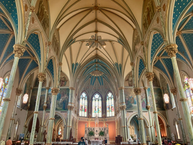 The Cathedral Basilica of St. John the Baptist was open when we arrived Saturday (closed to visitors on Sundays) and we were happy to be able to visit this impressive site. The interior with arches and stained-glass windows reminded us of some of the cathedrals we have visited in Spain and Portugal.
