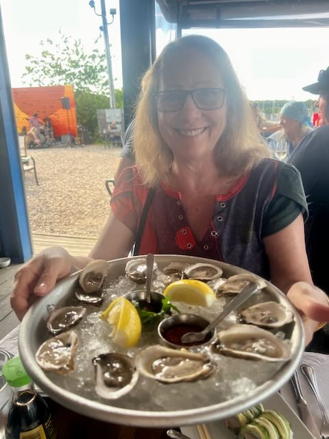 After a lot of walking, we had worked up a good appetite and headed out in search of some good oysters. Success! We ended up at Nicky’s on the Bay in Bayshore where we sampled some delicious local oysters. Even in late June the air had a chill to it, and we found ourselves shivering on the outside terrace. There was a vast metered parking lot (only $1/hr.) and lots of seating. They don’t take reservations. We would indeed recommend it!