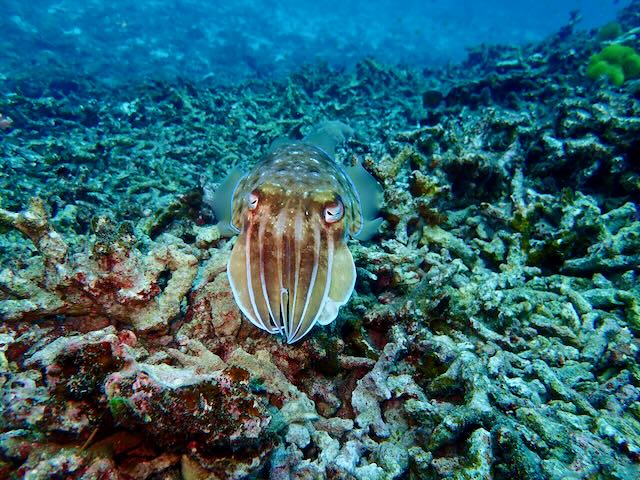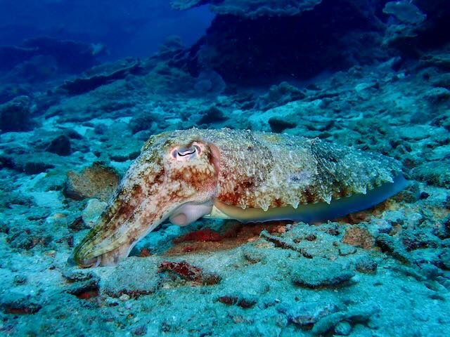 We also saw our first cuttlefish ever on this dive which was amazing. A master of disguise, this 18-inch fellow was hovering on the bottom, and we almost missed him! The guide was pointing out something else and wow, there he was!