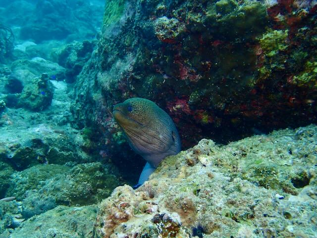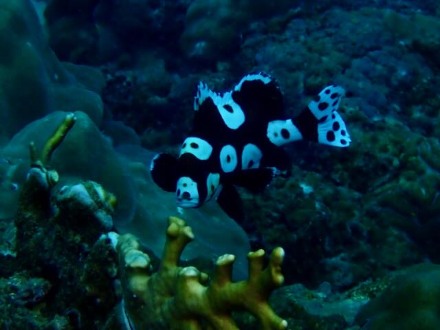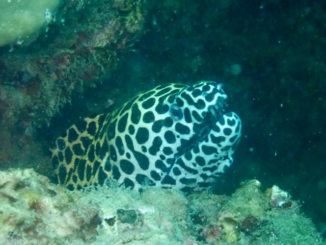 We saw plenty of life out there and one of the best finds was a honeycomb moray eel. We also loved the juvenile harlequin sweetlips which is black and white and looks so different than the adult form which is more speckled.