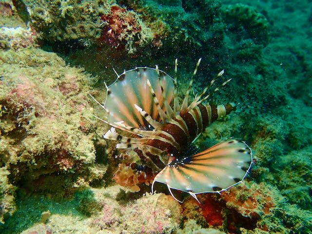 Also fairly shallow, much of this dive was done in the 60-foot range and we saw large boulders and huge coral structures. There were vast patches of what looked like elkhorn coral and staghorn coral. Many enormous mushroom-like coral structures were quite impressive.