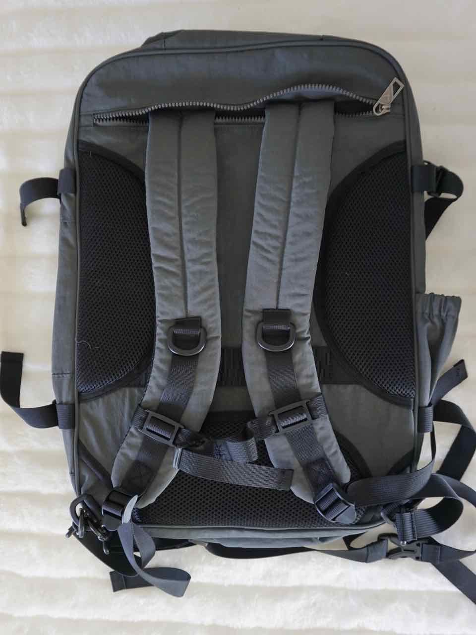 The bag has a capacity of 44 liters but compresses to 38 liters after zipping up the compression zipper. This changes the thickness of the bag from 9.8 to 7.9 inches, small enough for those discount airlines!