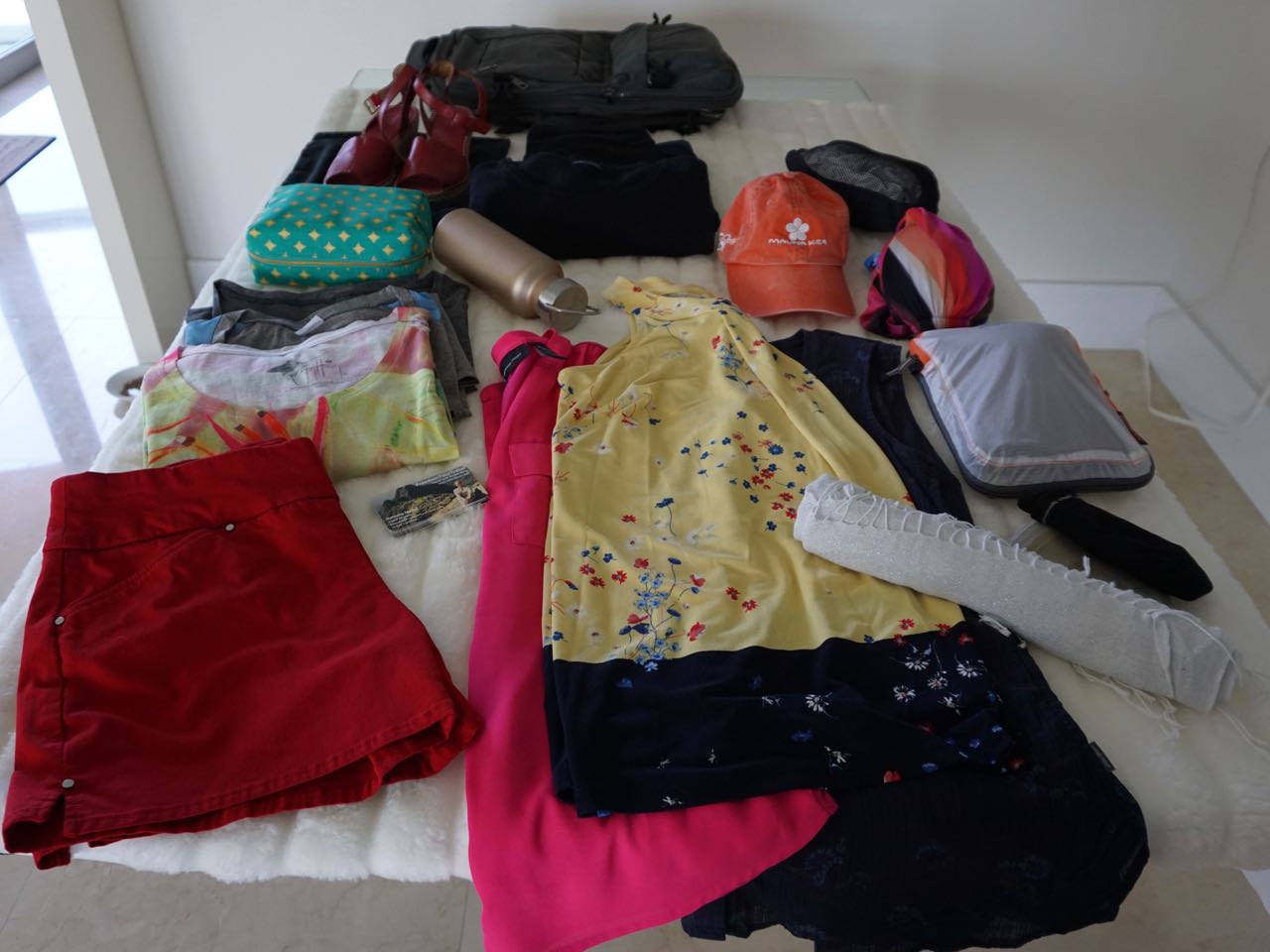We can fit two nice packing cubes in the top, and easily two more at the bottom along with a pair of shoes. I managed to pack two pairs of pants, one pair of shorts, two T-shirts, one sweater, a dress, a shawl, a bathing suit, a pair of sandals, a raincoat, a hat, my undergarments and my toiletry pouch all in the main compartment! I even had lots of room left. To see how roomy the knapsack was, I added another packing cube filled with stuff I wouldn’t need to bring (lets call it shopping and souvenirs!) and even with all that I had room for more!