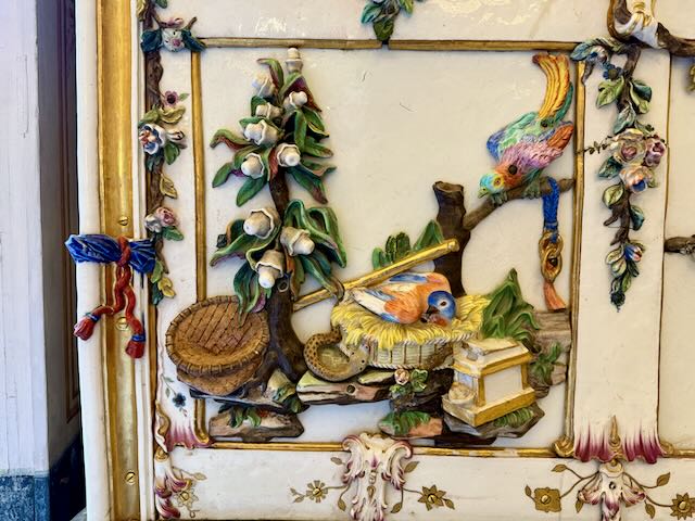 A central porcelain chandelier shaped like a palm tree with climbing figurines crowns the masterpiece of a room. It is spectacular and unlike anything we had ever seen elsewhere!