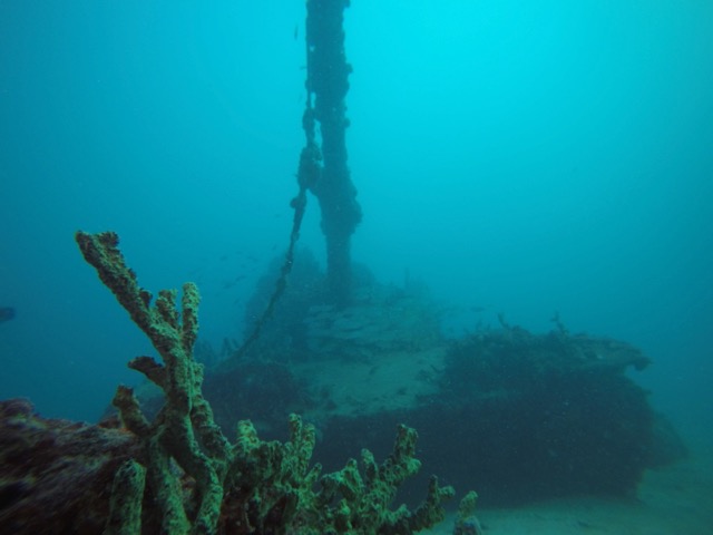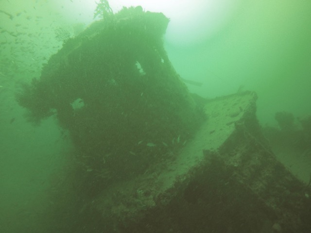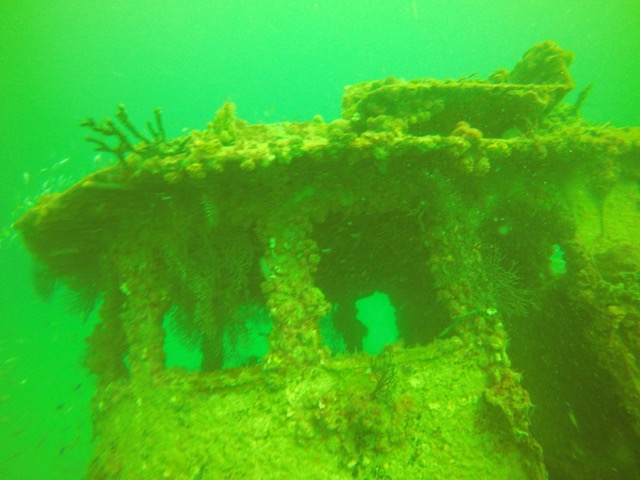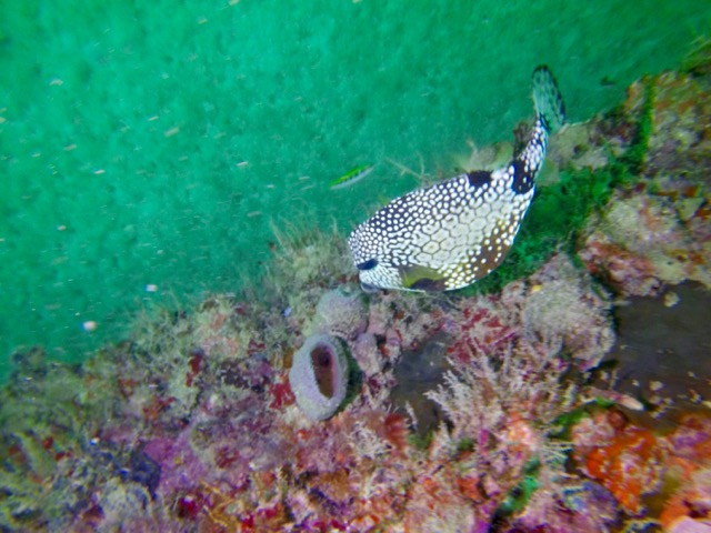 That day our dives consisted of the C-One—a 120-foot tug boat that was sunk in 1990. The vessel is at about 60-70 feet of depth and is in one piece with lots of growth and full of sea life. The fact that it’s tilting over at almost 45 degrees makes for many interesting photos. Our visibility was about 40-50 feet so a little hard to get the whole tug into a good shot but it was a fun dive.