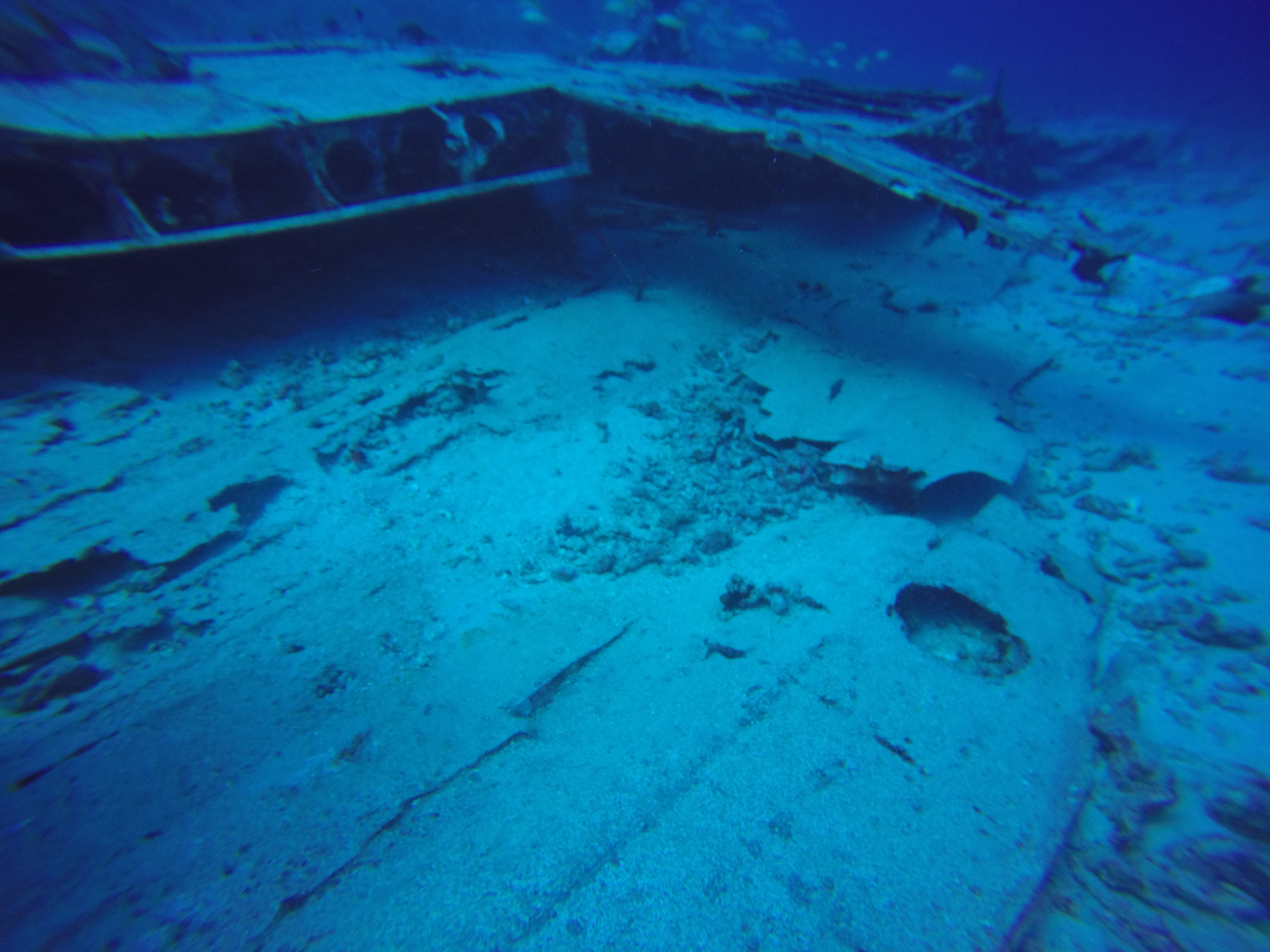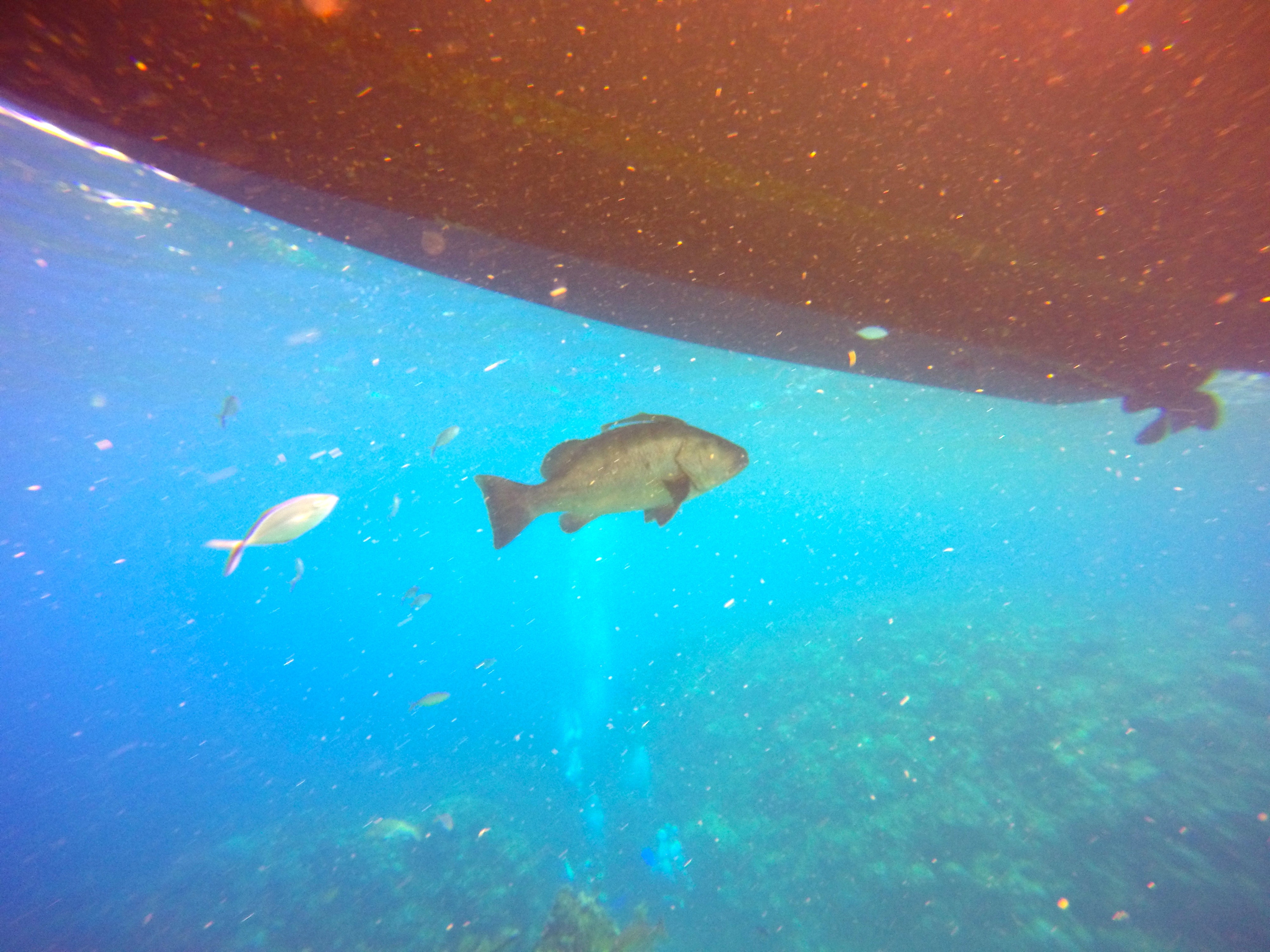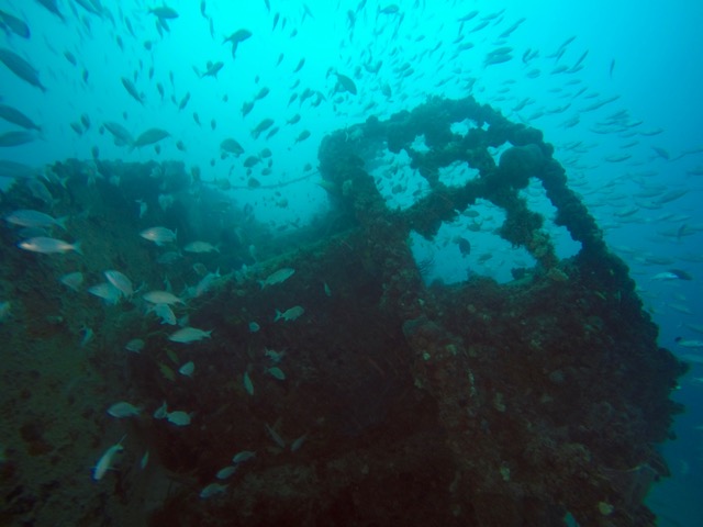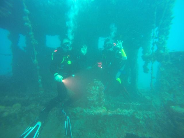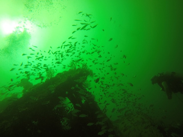 Our first dive site was the Dema Trader, which looks like a wreck but is in reality an artificial reef. The 165-foot freighter was sunk on purpose to create a habitat suitable for a variety of marine life. For extra hiding places, concrete culvert pipes and junction boxes were added into the cargo hold. Sections were removed to create an opening large enough to enter into the steering cabin for a great photo op!