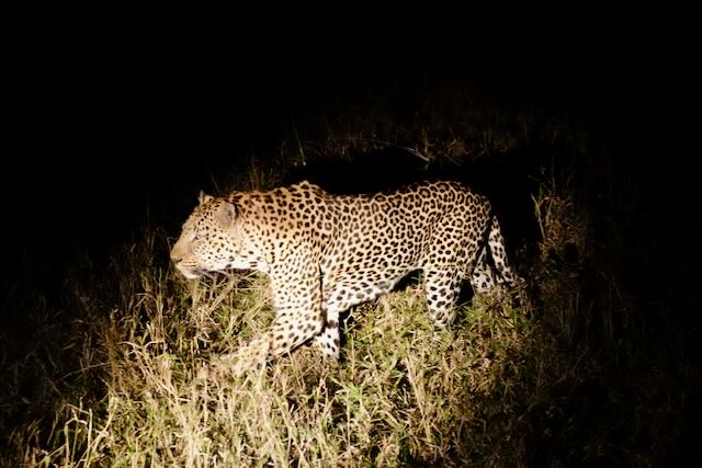As always MalaMala did not disappoint. A beautiful leopard crossing the road was soon seen and our guide Lauren followed it into the bush for a while. A great start. We spotted a host of birds along with the usual antelopes, elephants, giraffes, baboons, and more. As light faded, we headed back to the camp and on the way we even saw two, not one, genet cats!