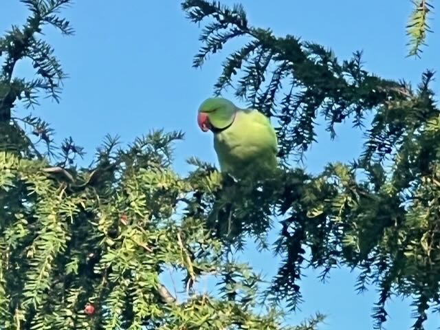 We were awakened by a chattering outside our window and were surprised to see three emerald green parakeets siting in the tree just outside our window. Upon further reading, there are tens of thousands of these in London now. Some credit (or blame) Jimi Hendrix for having released a breeding pair back in the summer of love… Beautiful birds!
