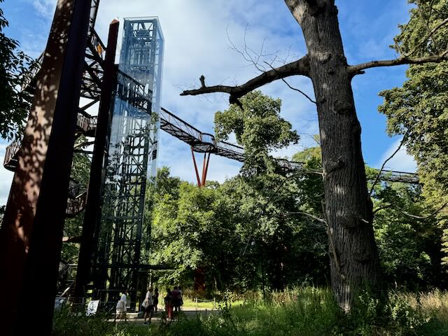 Some modern art pieces such as a metal structure called the Hive are present.