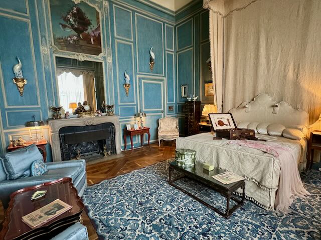 Similar wooden doors and shutters were in the room along with the octagonal wood framed painted ceiling and epoch furniture. The queen sized 4-poster covered bed was just like the ones we’d been seeing at the museums we were visiting. A decorative fireplace, wall-mounted chandeliers, antique carved tables and cabinetry on a royal carpet completed the look.