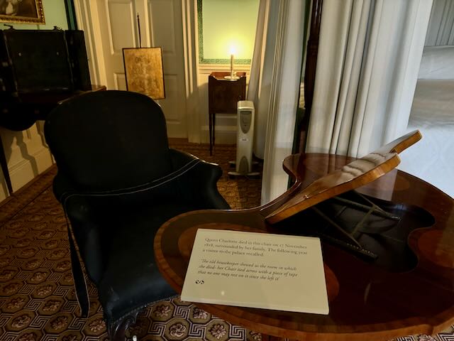 You can visit the very bedroom where Queen Charlotte died sitting in her black horsehair armchair in 1818. Princess Mary had said they had the consolation of having seen her pass away with a smile on her face without suffering.