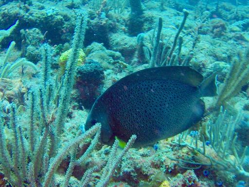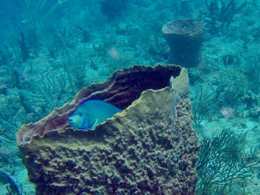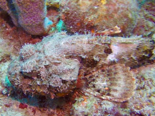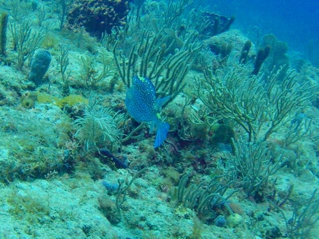 The visibility was much better than the last time at the wreck and we estimated 40-50 ft. Even at a 70 ft depth, the colors were vivid on the coral encrusted hull of the United Caribbean on this clear day. We didn’t see our friend the Goliath Grouper, but did see a lot of small reef fish, some sand divers and a lionfish. We were using Nitrox again (also our plan when diving multiple days in a row) allowing for more bottom time to explore, We’re getting used to it and finding that we’re less tired after a couple of dives than we used to be using just air. Then again, we are also getting more into shape and getting more at ease with our diving.