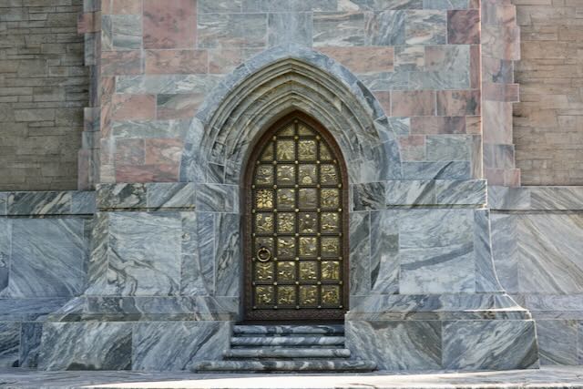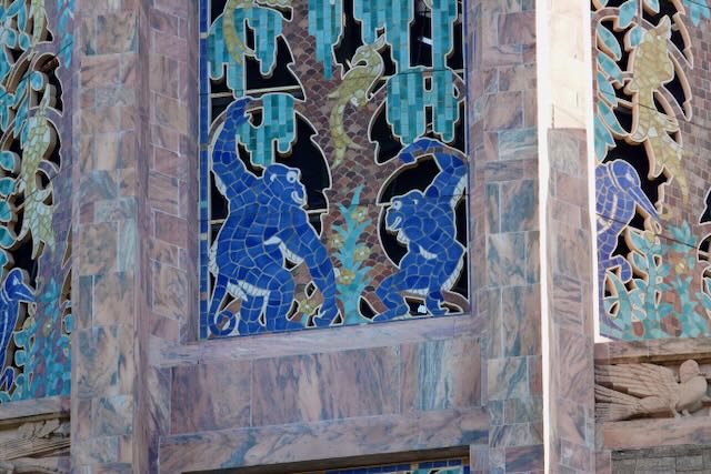 The exquisite tower is made of pink marble and coquina and is decorated with intricate tile work reminiscent of stained-glass picturing sea creatures, birds and animals. There is also a sundial on one of the façades and a brass door on the side facing the Reflection Pool.