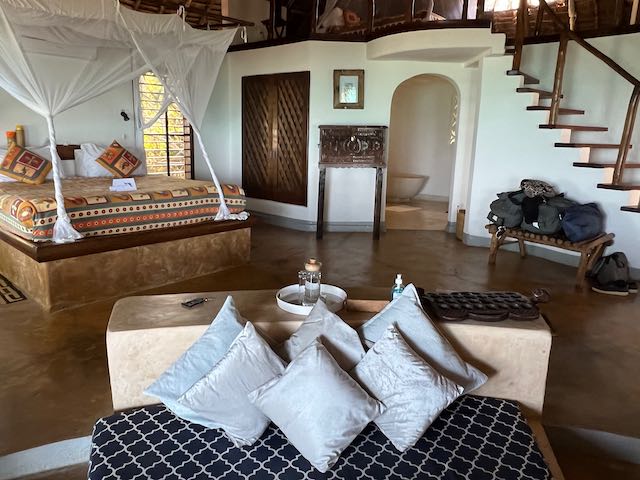 The individual cabin units were large and equipped with thatch roofs. Our unit opened to a fantastic view of the Indian Ocean. We marveled at seeing the tide come in over the shallow shoreline.